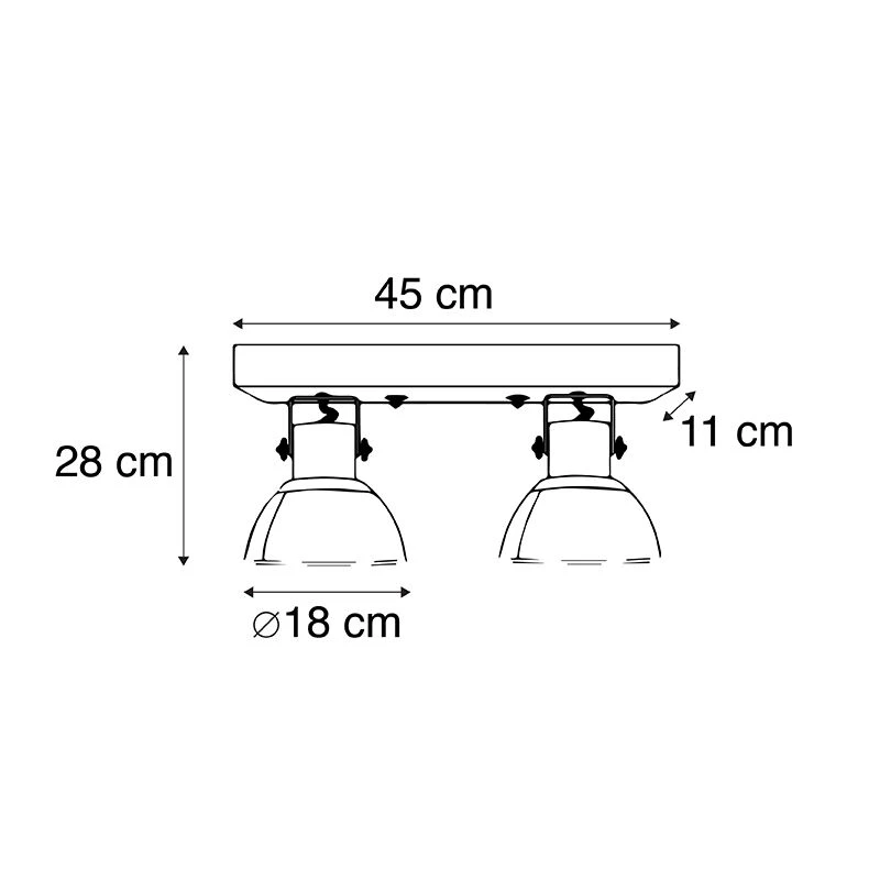 Es hat eine Höhe von 28 cm und eine Länge von 45 cm. Die Kappen des Spots haben jeweils einen Durchmesser von 18 cm.