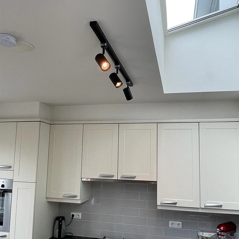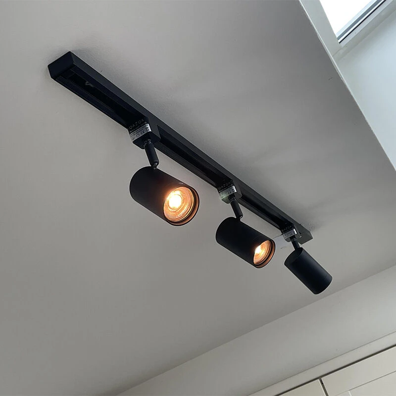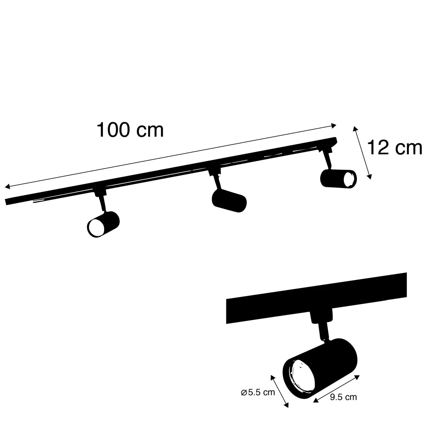Die Leuchte ist 95 cm lang und 19,5 cm hoch. Die Montageplatte ist 92 cm lang und 3,3 cm breit. GU10 Spots (max. 50 Watt) passen in die Spots, müssen aber noch bestellt werden. Die Schienenspots sind auch einstellbar und zur Verwendung in Kombination mit einem externen Dimmer geeignet (Dimmer nicht im Lieferumfang enthalten). Dies sind 1-Phasen-Spots, dh alle Lampen auf der Schiene werden gemeinsam angesteuert und sind daher immer gemeinsam aus- oder eingeschaltet.