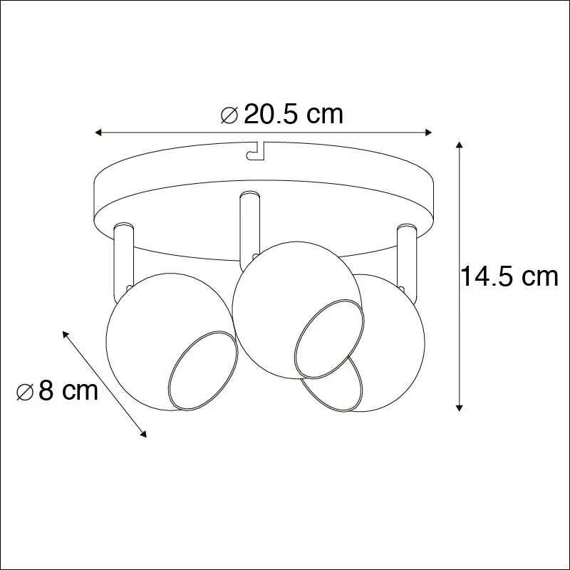 Die Lampe hat eine Höhe von 14,5 cm. Die Montageplatte hat einen Durchmesser von 20,5 cm. Sie beenden die Lampe mit drei Lichtquellen mit einer GU10-Fassung (max. 35 Watt), diese muss noch separat bestellt werden. Die Lampe ist mit einem externen Dimmer dimmbar (Dimmer nicht im Lieferumfang enthalten).