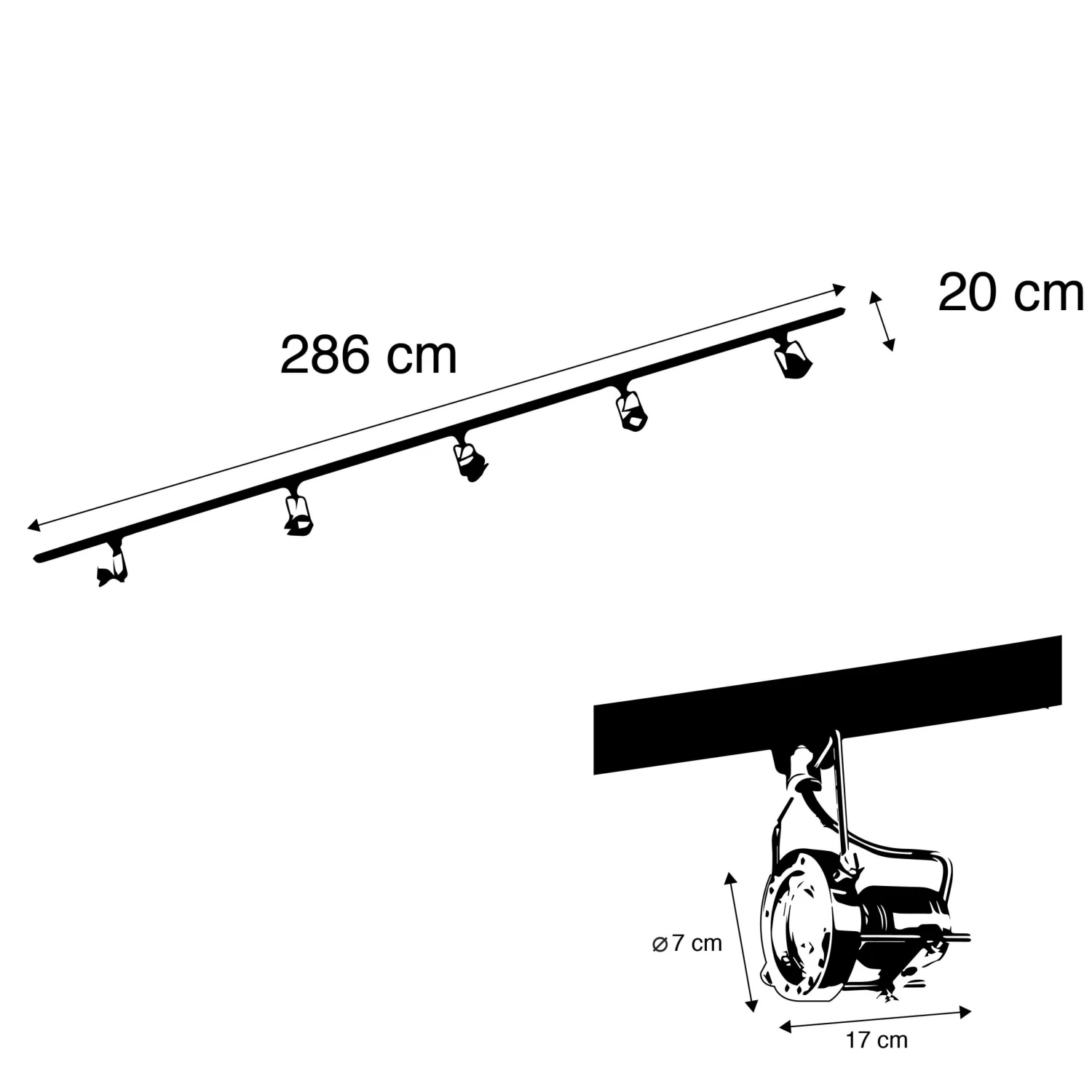 Die Leuchte ist 286 cm lang und 20 cm hoch. Du benötigst 5 GU10 Lampen (max. 50 Watt). Die Schienenspots sind auch einstellbar und zur Verwendung in Kombination mit einem externen Dimmer geeignet (Dimmer nicht im Lieferumfang enthalten). Dies sind 1-Phasen-Spots, dh alle Lampen auf der Schiene werden gemeinsam angesteuert und sind daher immer gemeinsam aus- oder eingeschaltet.